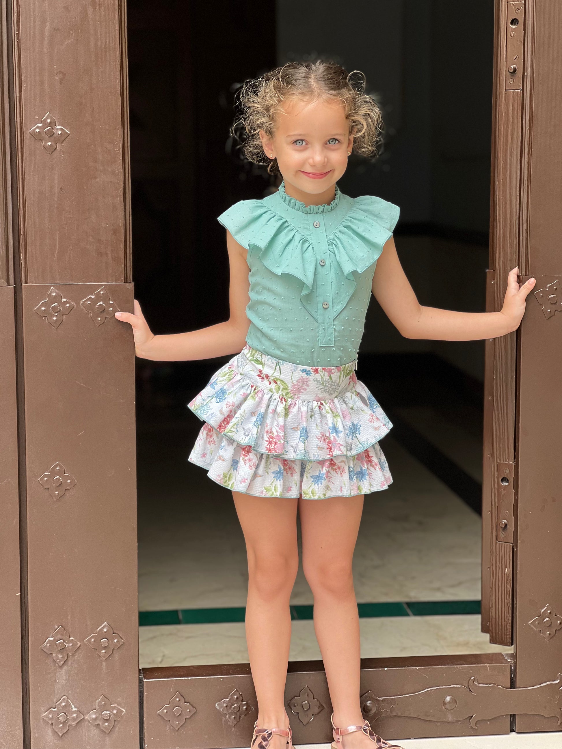 Elevate your wardrobe with this charming skirt and blouse set, featuring a delicate floral skirt paired with a vibrant green ruffled blouse. Perfect for adding a fresh, feminine touch to any occasion, this ensemble combines comfort and style effortlessly. The ruffles add playful movement, while the floral pattern brings a timeless elegance, making it an ideal choice for both casual outings and special events. Embrace a look that’s both eye-catching and versatile with this beautifully coordinated set.